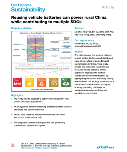 Recently, Professor Zhu Lei and Assistant Professor Yao Xing from the SEM at Beihang University, along withtheircollaborators, have made new progress in the research on promoting thereuseof retired power batteries in China. The research titled "Reusing Vehicle Batteries Can Power Rural China while Contributing to Multiple SDGs,"waspublished on April 26, 2024, in the journal "Cell Reports Sustainability," a subsidiary of "Cell." Professor Zhu Lei and Assistant Professor Yao Xing are the co-first authors. Dr. Su Bin from the Energy Research Institute at the National University of Singapore and Professor Wang Shouyang from the School of Economics and Management at the University of Chinese Academy of Sciences are the co-corresponding authors. The author team also includes Professor Hao Han from the School of Vehicle and Mobility at Tsinghua University and Professor Zhou Peng, the vice president of China University of Petroleum (East China).