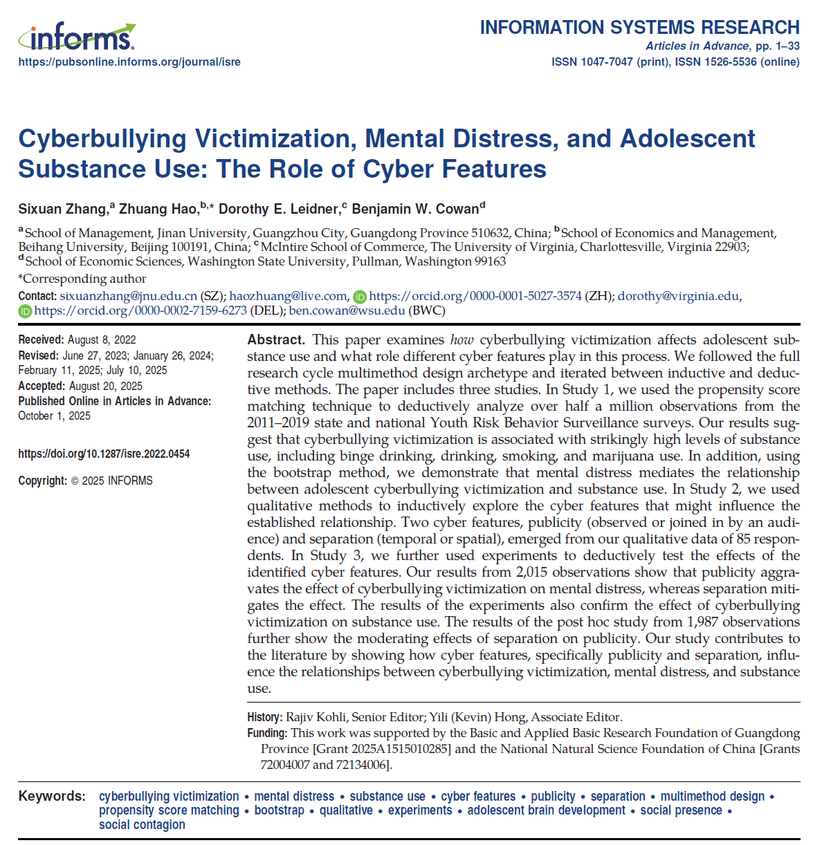 A research paper co-authored by Associate Professor Zhuang Hao (Corresponding Author), in collaboration with Zhang Sixuan (First Author) from Jinan University, Dorothy E. Leidner from the University of Virginia, and Benjamin W. Cowan from Washington State University, has been published in Information Systems Research—a leading international journal listed among the UTD24 top-tier publications. The paper is titled “Cyberbullying Victimization, Mental Distress, and Adolescent Substance Use: The Role of Cyber Features.”