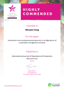 Recently, the results of the 2023 Emerald Literati Awards for Excellence were announced. Professor Wenyan Song, as the lead author of the paper "Substitution and complementarity dynamics in configurations of sustainable management practices," received the 2023 Emerald Literati Awards - Highly Commended Paper international award.